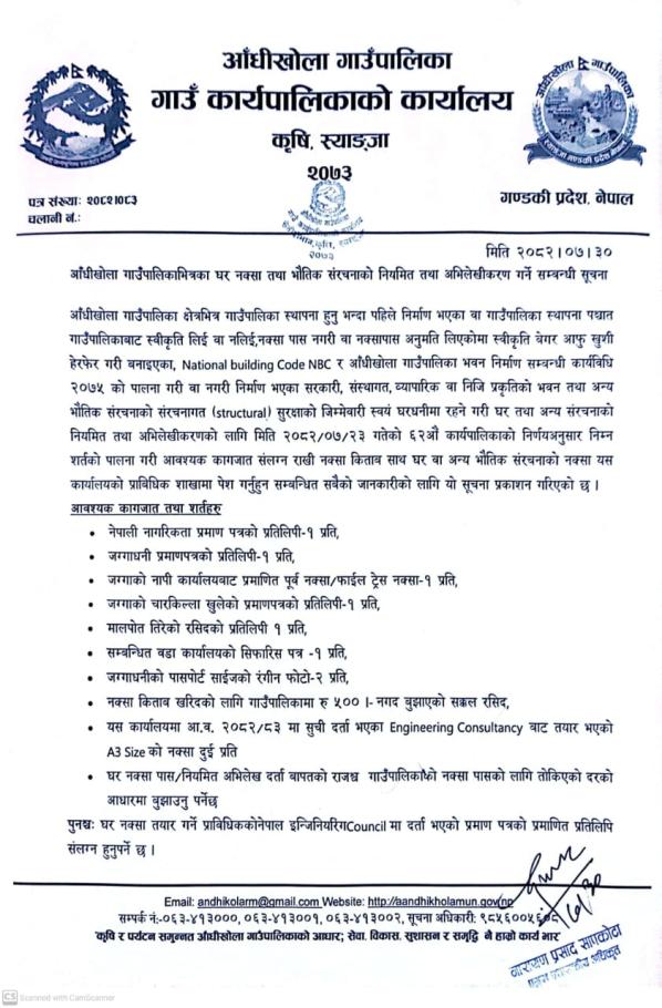 आँधीखोला गाउँपालिका भित्रका घर नक्सा तथा भौतिक संरचनाको नियमित तथा अभिलेखीकरण गर्ने सम्बन्धी सूचना
