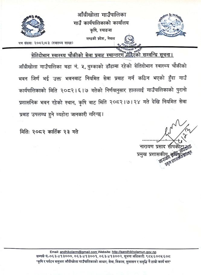 सेतिदोभान स्वास्थ्य चौकीको सेवा प्रवाह स्थानान्तरण गरिएको सम्बन्धी सूचना